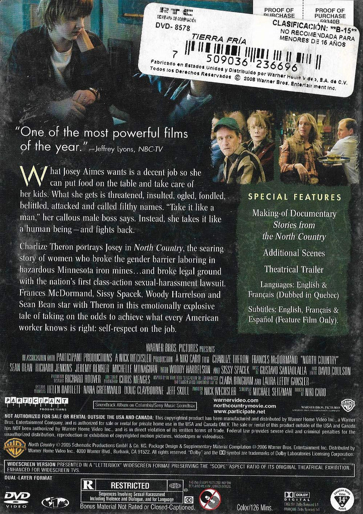 Theron in North Country. But the job proves to be almost as harrowing as her marriage; the male miners, resentful of women taking jobs, verbally abuse and play humiliating pranks on the female miners. After being physically assaulted by a coworker, Josey tries to fight against the harassment, but none of the other women will join her case for fear that things will only get worse. North Country, directed by Niki Caro (Whale Rider), makes the women's experience palpable for the audience without overdoing it. But the lawsuit is only part of the movie; the gut impact of North Country comes from the devastating effect the lawsuit has on Josey's family, friends, and coworkers--thanks to an incredible ensemble cast that includes Sissy Spacek (In the Bedroom), Sean Bean (Lord of the Rings), Richard Jenkins (Six Feet Under), Woody Harrelson (The People vs. Larry Flynt), and the always powerful Frances McDormand (Fargo, Mississippi Burning). The courtroom histrionics don't always ring true, but the family conflict is riveting and deeply moving. Based on the book Class Action: The Story of Lois Jenson and the Landmark Case That Changed Sexual Harassment Law. --Bret Fetzer